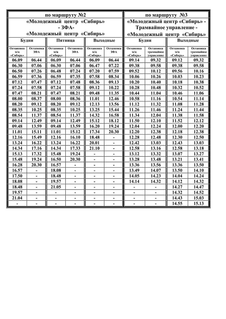 «Молодежный центр «Сибирь» — ЗФА»| Расписание движения трамваев по маршруту №2 | Расписание движения трамваев по маршруту №3 | ||||||||